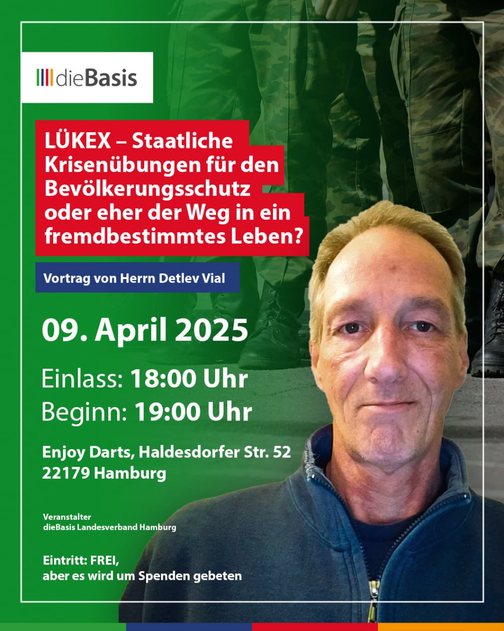 Herr Detlev Vial, Jahrgang 1966, hat die Qualifikation als Pflegedienstleitung, hat Jahrelang freiberuflich als Dozent in der Pflege gearbeitet. Das Thema LÜKEX ist ihm im Jahr 2022 vor die Füße gefallen. Seitdem hat er sich mit dieser Thematik eingehend beschäftigt und sich das näher angeschaut. Dabei musste er mit Erstaunen feststellen, dass alles in Planspielen vorgegeben wird. Aufklärung ist ihm hierbei ein Anliegen.